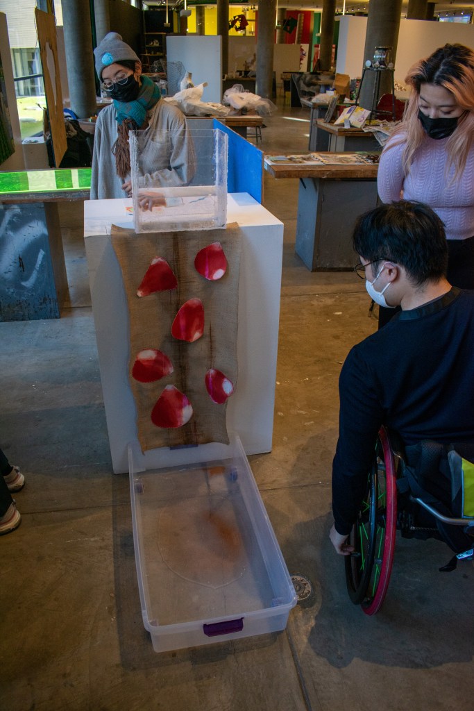 Persephone’s Hand is a sculpture that includes a wax cast of my hand, a constructed water tank with three leaking points that drip over pomegranate seeds and wash away their image. It explores sexual violence as a form of death and rebirth into a new form that washed away the old identity, represented by the pomegranate seeds.